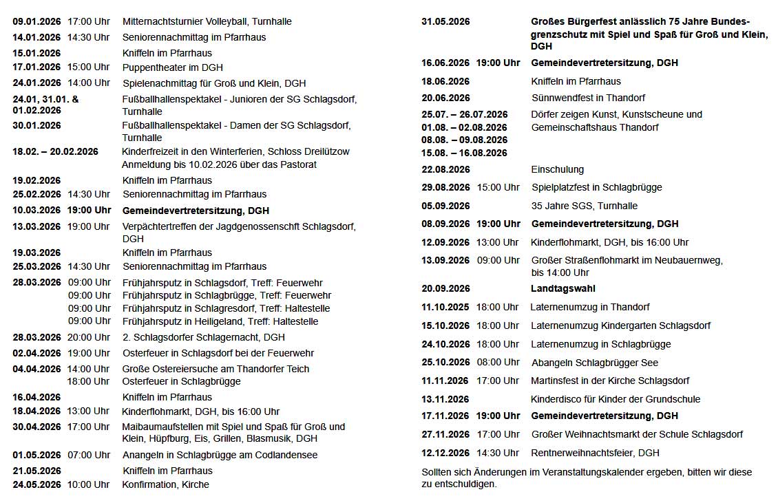 Veranstaltungen in Schlagsdorf 2026