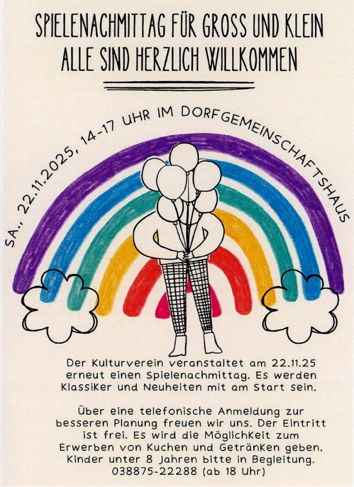 Der Kulturverein veranstaltet am 22.11.2025 erneut einen Spielenachmittag. Es werden Klassiker und Neuheiten mit am Start sein.
